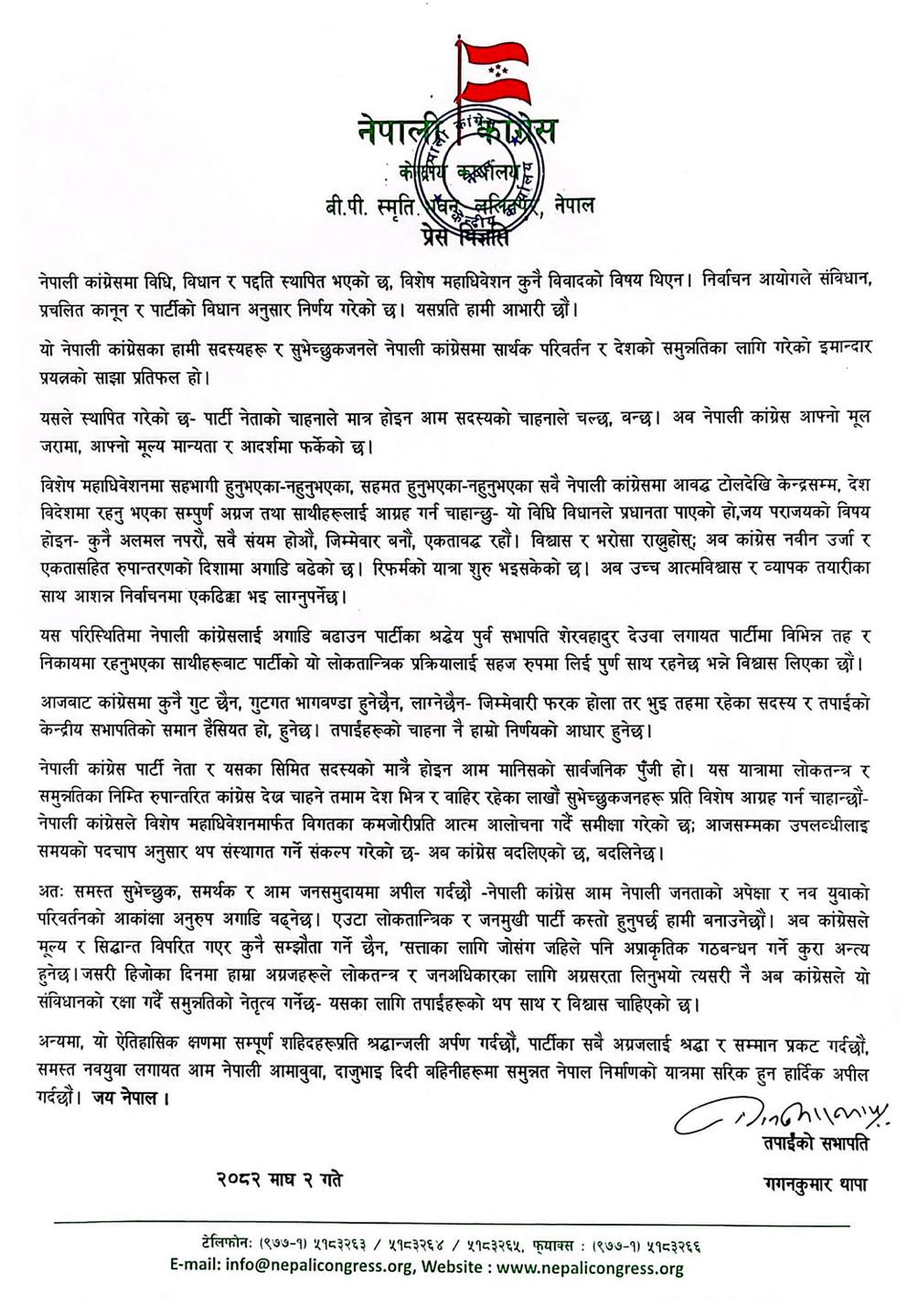 काठमाण्डौं । निर्वाचन आयोगबाट बैधानिकता पाए लगत्तै नेपाली काग्रेसमा सभापति गगन कुमार थापाले प्रेस बिज्ञप्ती मार्फत एकताबद्ध...